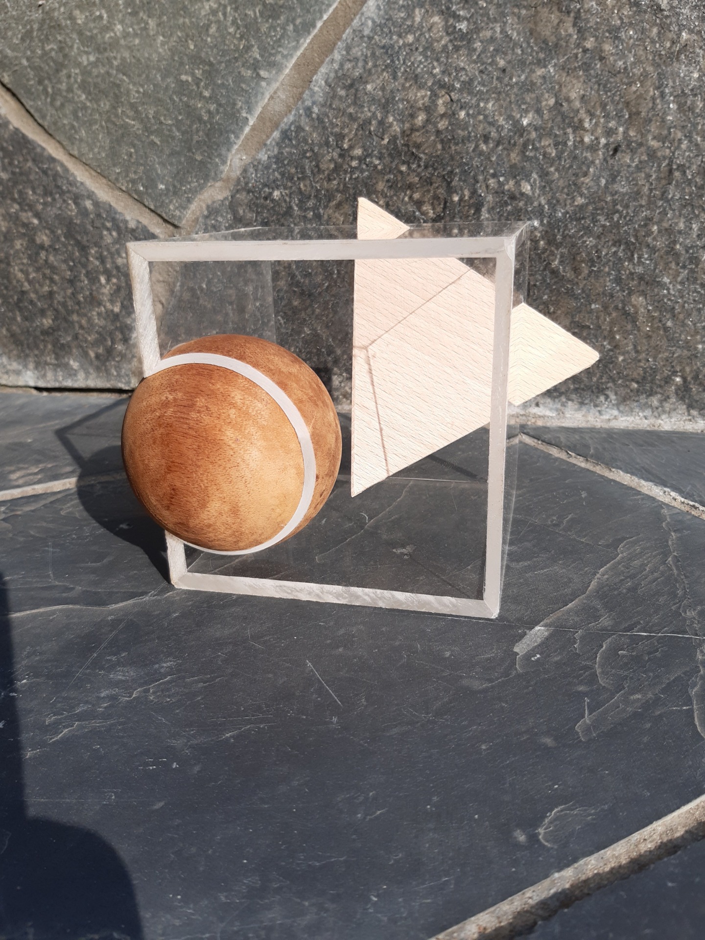Figur laget i plexiglass og tre. I kuben av plexiglass er det skåret ut tilpassede hull i riktig vinkel til en tetraede og en kule, det vil si at de sitter pent fast i deres posisjon uten at noen av formene er limt til en annen. Kulen kan derfor også dreies rundt.